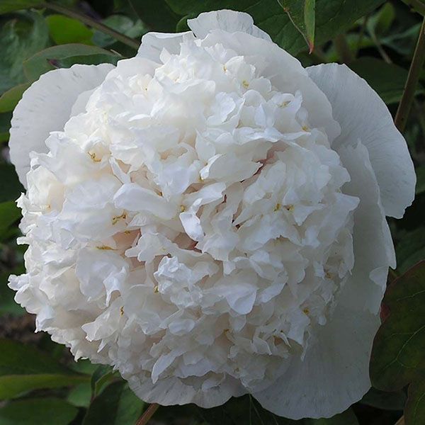 Цветы пиона Снежная башня нежно-белого оттенка. Но у основания лепестков можно рассмотреть светло-оранжевый мазок.